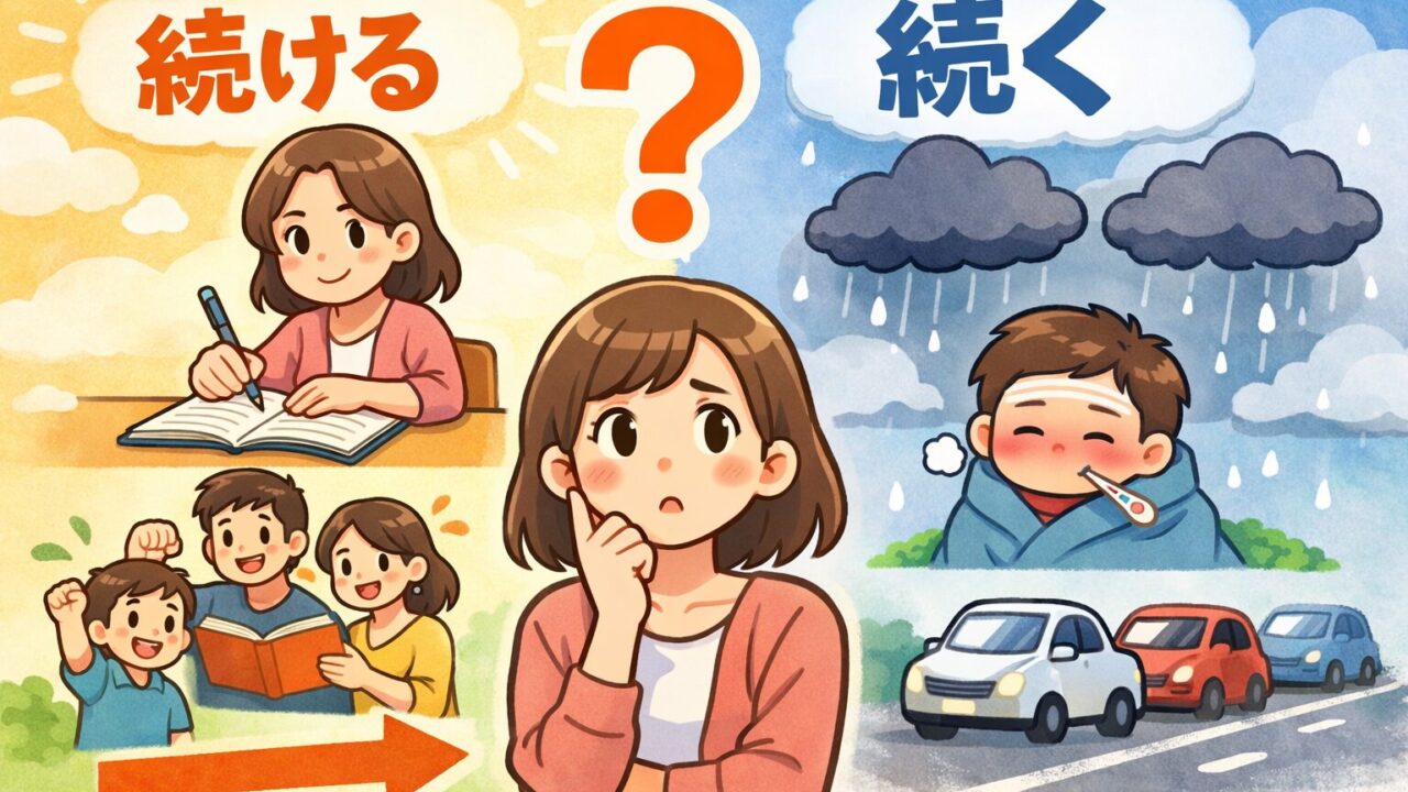 「続ける」と「続く」は、意味が近く、会話では通じてしまうため、違いを意識する機会が少ない言葉です。その結果、書く場面になると急に不安になる人も多いはず。