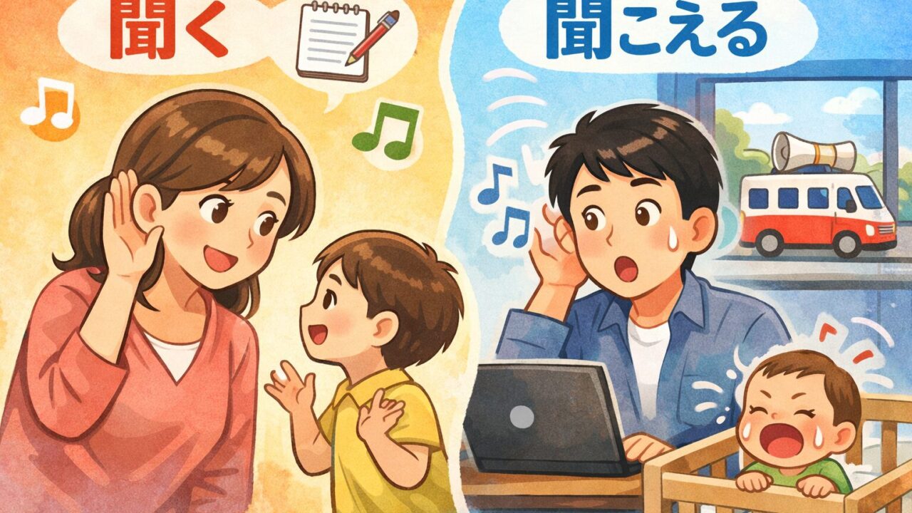この記事では、家庭や仕事の場面を例にしながら、「聞く」と「聞こえる」の使い分けをやさしく整理していきます。読み終わるころには、「あ、こう考えればよかったのか」と思えるはずです。