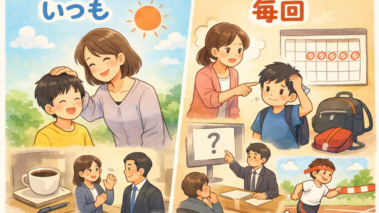 この記事では、「いつも」と「毎回」のニュアンスの差を、日常の場面に近い例でやさしく整理します。読んだあと、「あ、こう考えればよかったのか」と思える目安をお届けします。